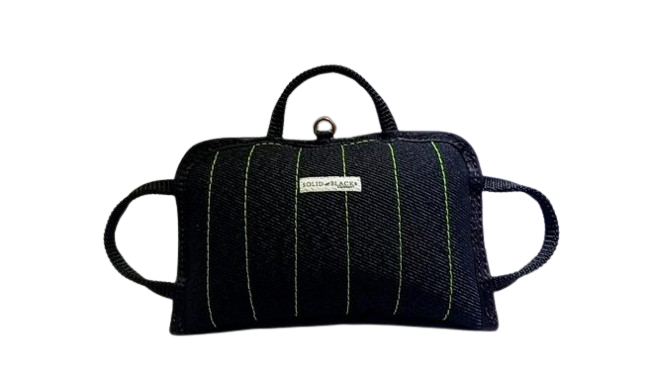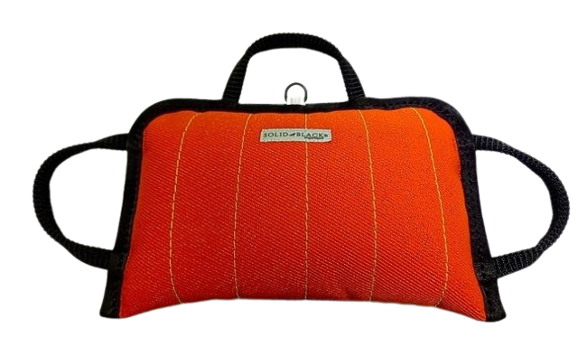 Mordedor canino tipo almohada con tres asas, confeccioinado en lino frances origen Belgica, refuerzo interno en cuero, ojo superior para mosqueton, medidas 38x25cm, adietramiento canino, dureza semi hard.